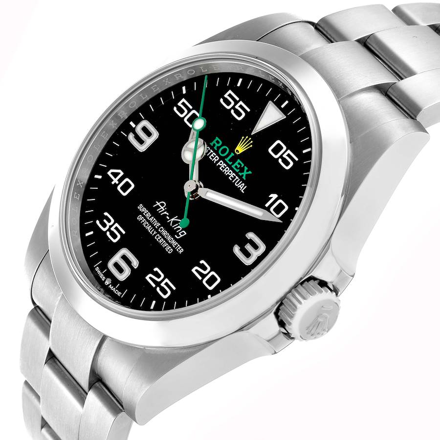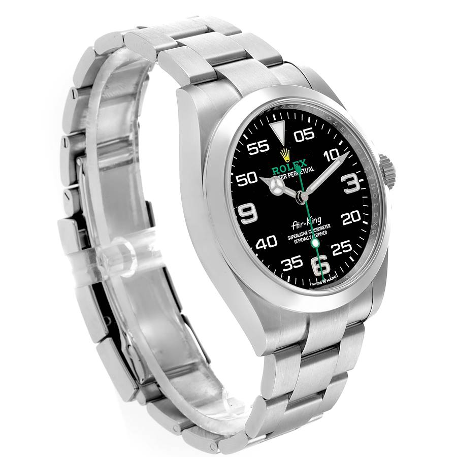 Replica Rolex Oyster Perpetual Air-King Steel Mens Automatic Watch 126900 Box Card. Officially certified chronometer automatic self-winding movement. Stainless steel oyster case 40.0 mm in diameter. Pointed crown guards. Rolex logo on the crown. Stainless steel smooth domed round bezel. Scratch-resistant sapphire crystal. Black dial with luminescent Arabic numerals at every five-minute mark and raised Arabic numeral hour markers at 3, 6, and 9 o'clock. Luminescent Mercedes hands and green luminescent lollipop-tipped seconds hand. Outer stick minute markers. Stainless steel oyster bracelet with a flip-lock clasp. Fits a 7 3/4" wrist.