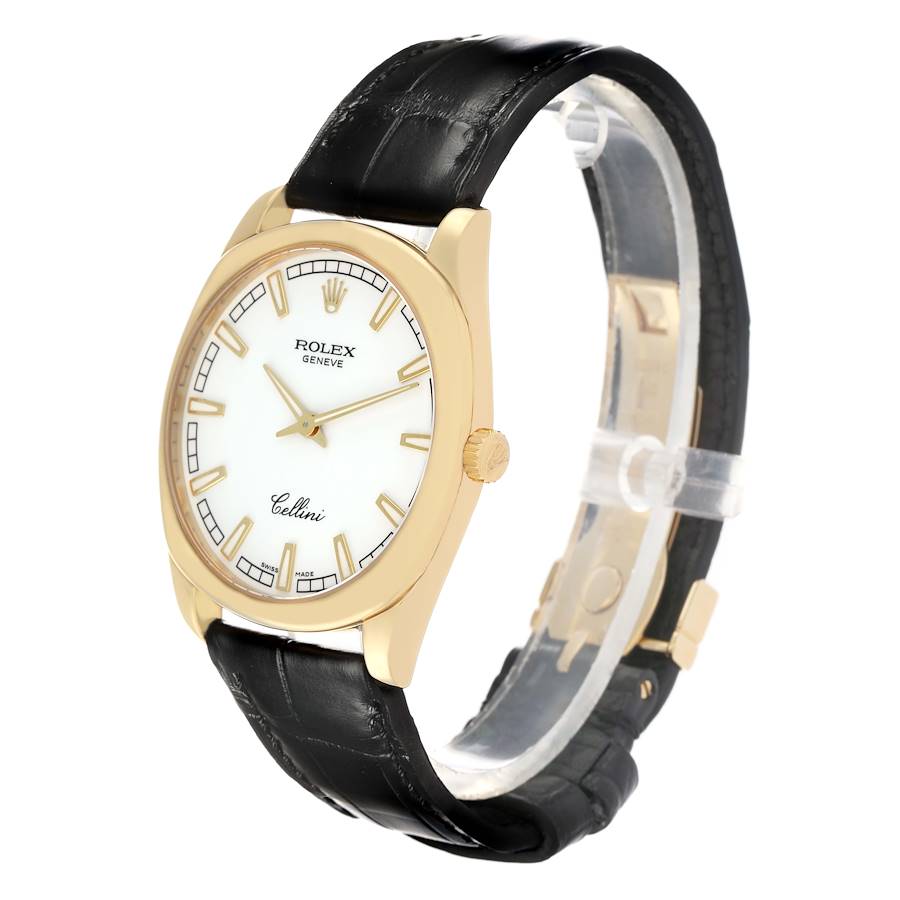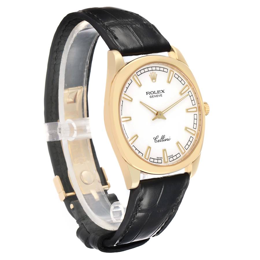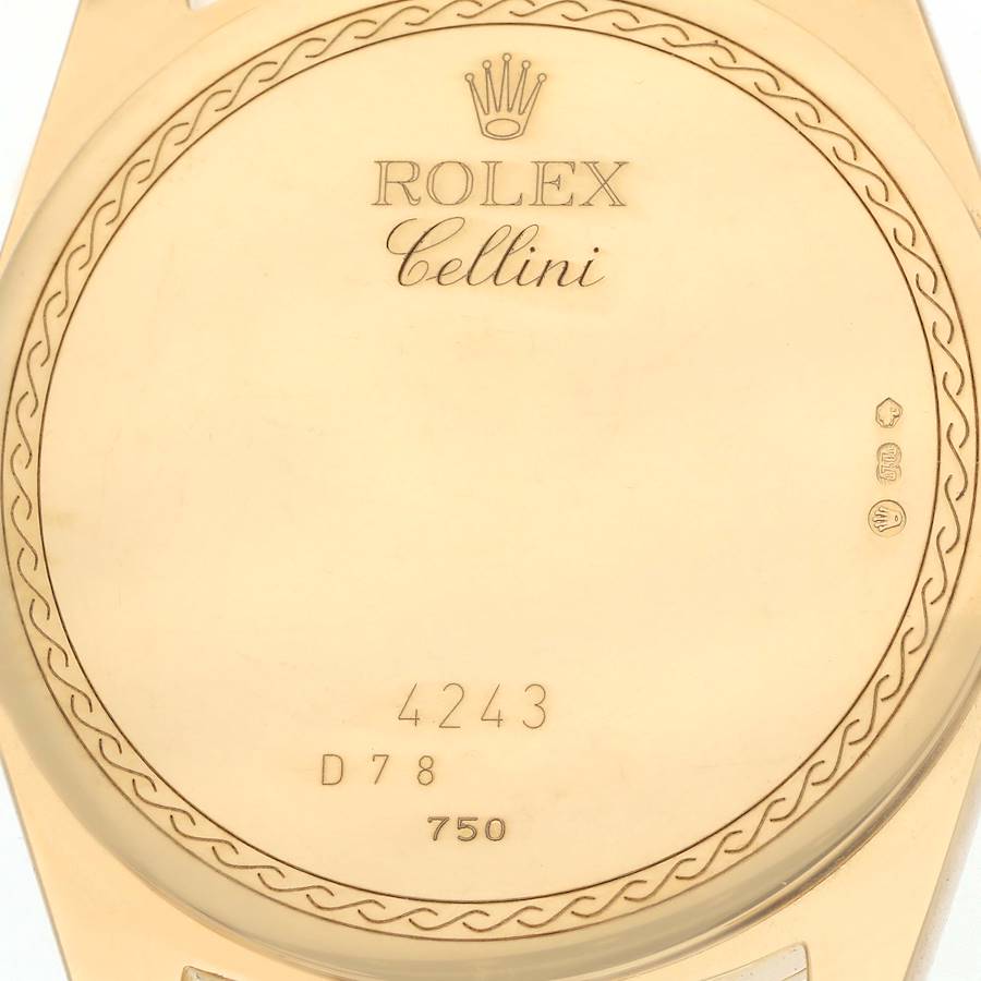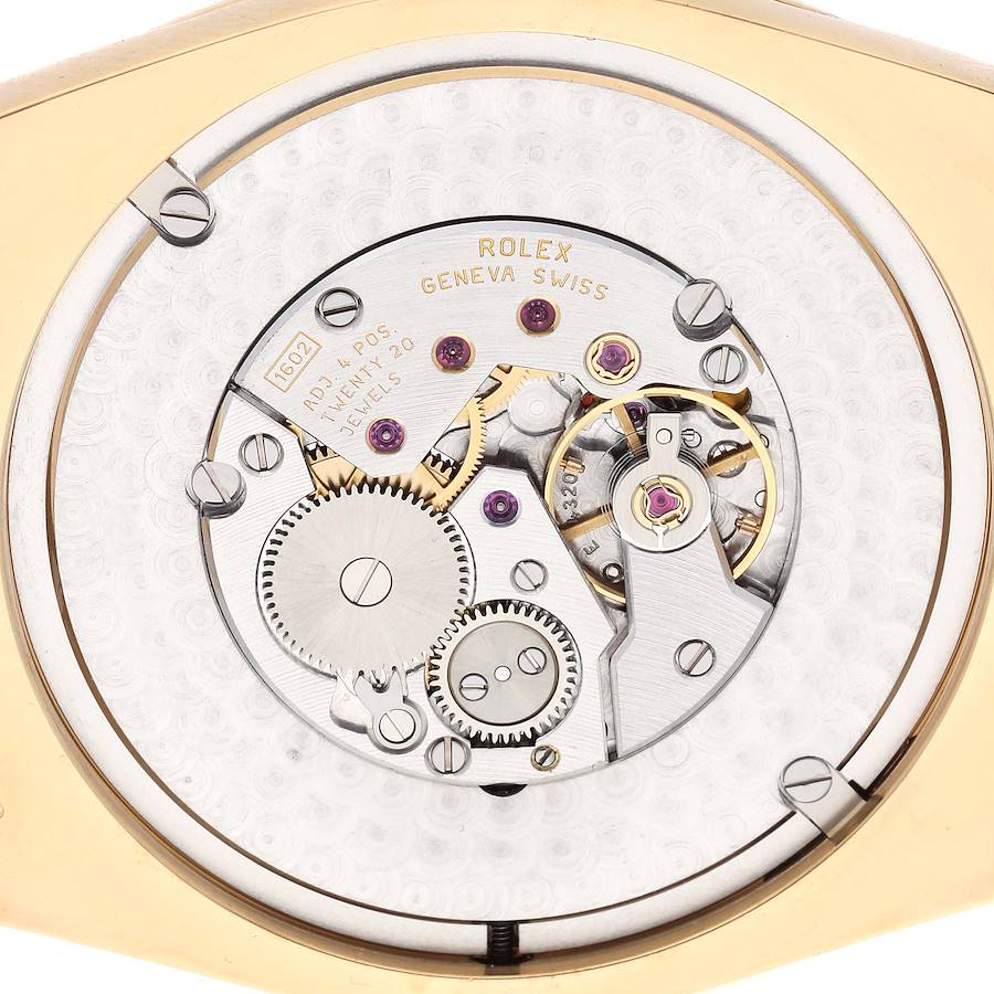 Case: 18k yellow gold rounded rectangular case 38.0 mm. Rolex logo on a crown.