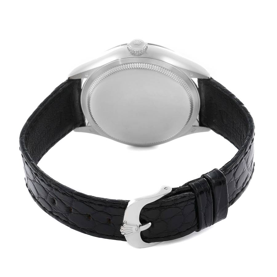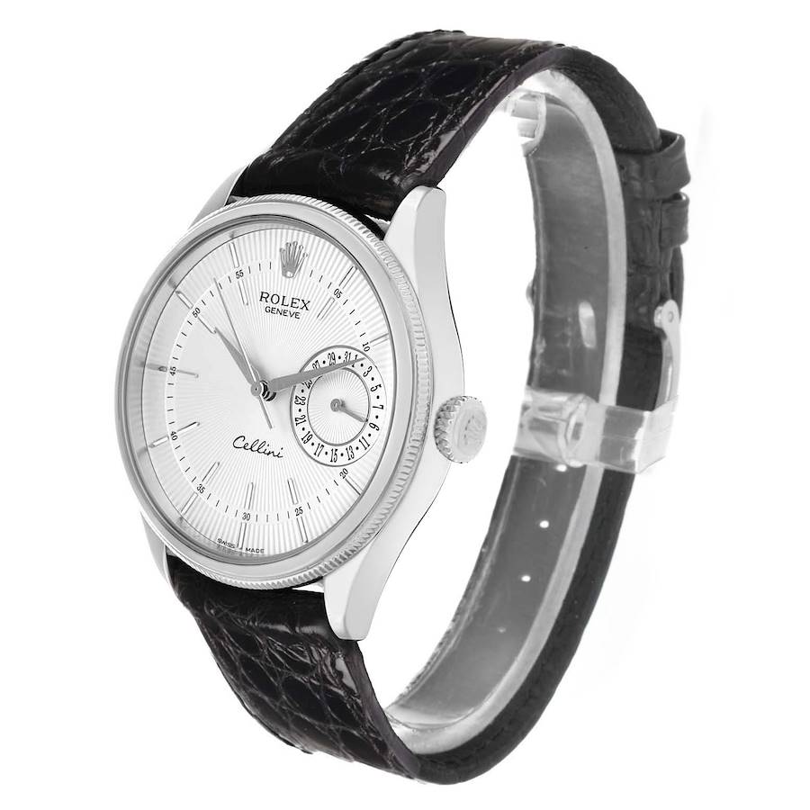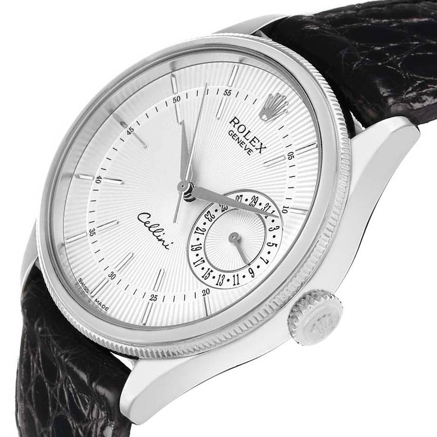 Replica Rolex Cellini Date White Gold Silver Dial Automatic Mens Watch 50519. Officially certified chronometer automatic self-winding movement. 18K white gold round case 39.0 mm in diameter. Rolex logo on the fluted crown. . Scratch resistant sapphire crystal. Silver sunburst guilloche dial with white gold baton hour markers and dauphine hands. Fine printed minute/seconds track. Pointer date subdial at 3 o'clock. Custom black leather strap with an 18K white gold tang buckle.