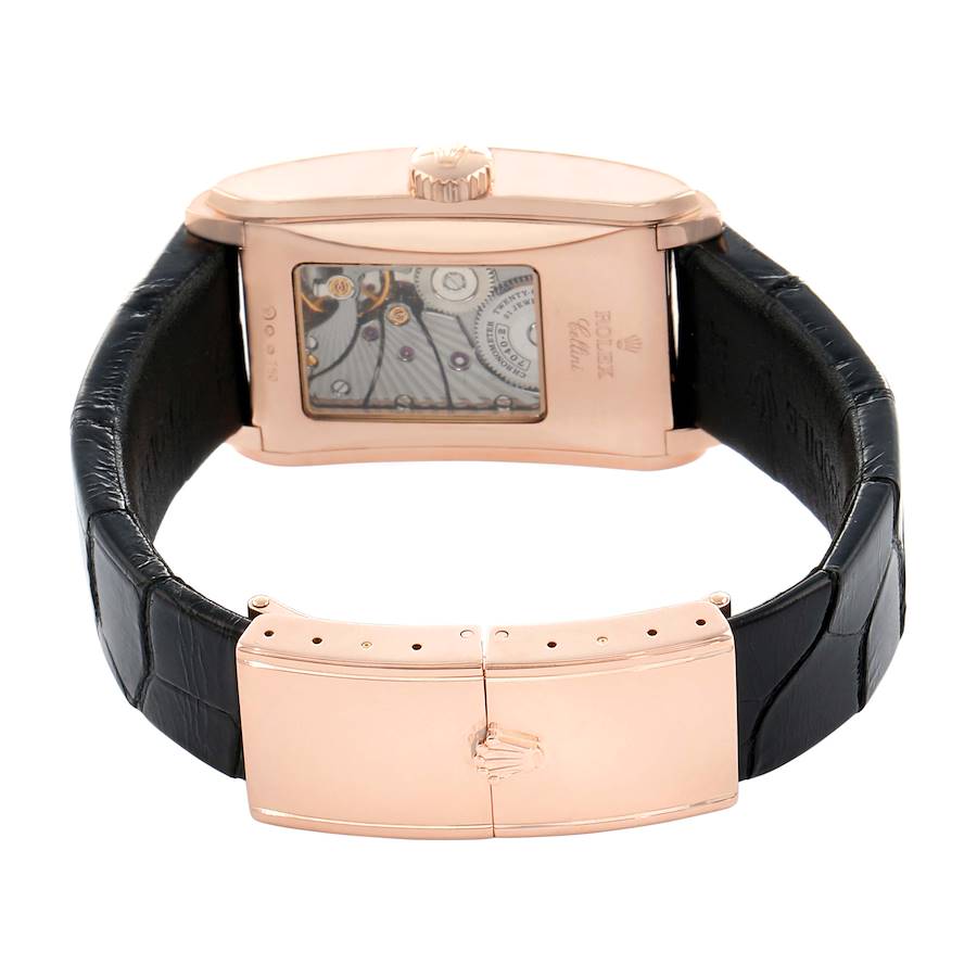 Case: 18k Everose gold case 28.0 x 47.0 mm. Rolex logo on the 18k rose gold crown. Exhibition transparent sapphire crystal caseback.