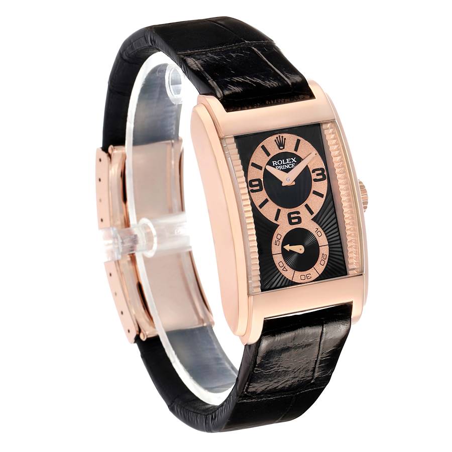 Replica Rolex Cellini Prince Rose Gold Black Dial Mens Watch 5442. Manual winding movement. 18k Everose gold case 28.0 x 47.0 mm. Rolex logo on the 18k rose gold crown. Exhibition transparent sapphire crystal caseback. . Scratch resistant sapphire crystal. Black and rose gold dial with double "Rayon Flamme De La Gloire" guilloche. Small seconds subdial at 6 o'clock. Black leather strap with 18k rose gold double deployant clasp.