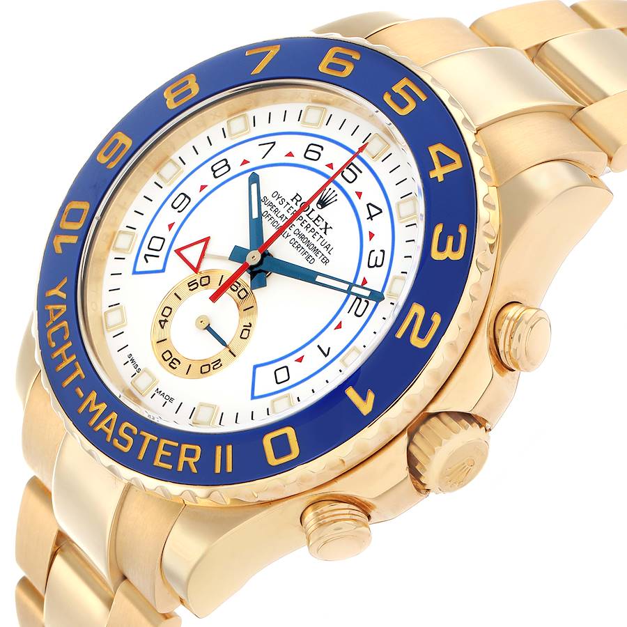 Replica Rolex Yachtmaster II Regatta Yellow Gold Mens Watch 116688. Officially certified automatic chronometer self-winding movement. 18K yellow gold oyster case 44.0 mm in diameter. Two 18k yellow gold pushers operate the chronograph functions. Pointed crown guards. Rolex logo on the 18k yellow gold screw-down crown. Blue Ring Command 90-degree rotating yellow gold bezel with a blue ceramic top ring. Scratch resistant sapphire crystal. White dial with luminescent baton hands and square yellow gold outlined hour markers. Red central chronograph hand. Regatta 1-10 countdown timer with a red arrow-shaped countdown hand. Yellow gold outlined 60 seconds subdial at the six o'clock position. Outer stick minute markers. Small seconds subdial at 6 o'clock. 18K yellow gold oyster bracelet with a flip-lock clasp. Fits an 8" wrist.