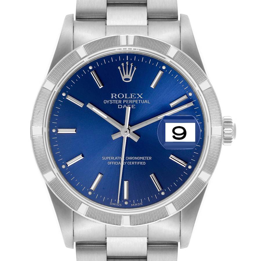Model Name: Replica Rolex Date Blue Dial Engine Turned Bezel Steel Mens Watch 15210