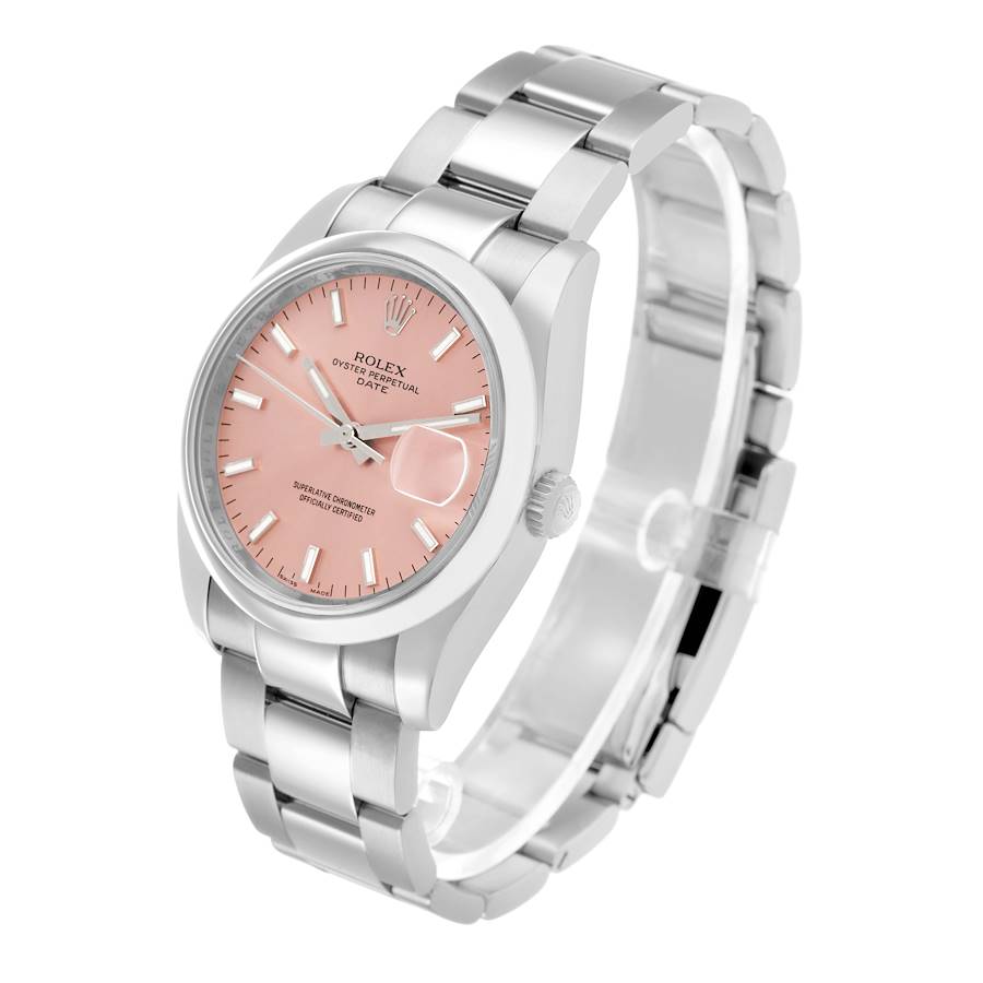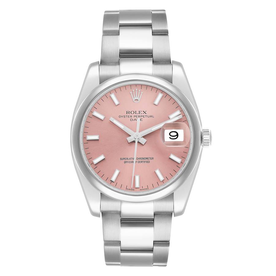 Replica Rolex Date Pink Dial Oyster Bracelet Steel Mens Watch 115200. Officially certified chronometer automatic self-winding movement. Stainless steel case 34.0 mm in diameter. Rolex logo on a crown. Stainless steel smooth domed bezel. Scratch resistant sapphire crystal with cyclops magnifier. Pink dial with luminous baton hands and hour markers. Minute markers around the outer rim. Date window at 3 o'clock aperture. Stainless steel oyster bracelet with an oysterlock clasp. Fits 7 1/4" wrist.