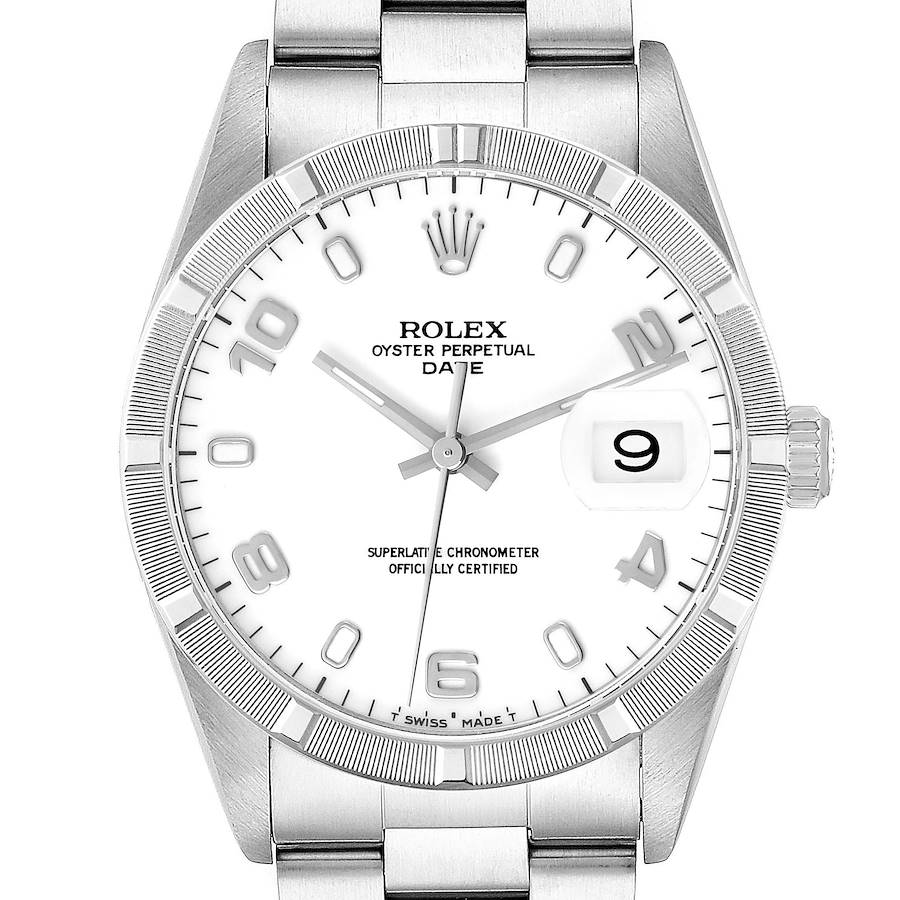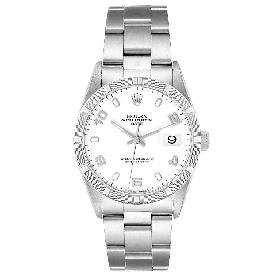 Model Name: Replica Rolex Date White Dial Engine Turned Bezel Steel Mens Watch 15210