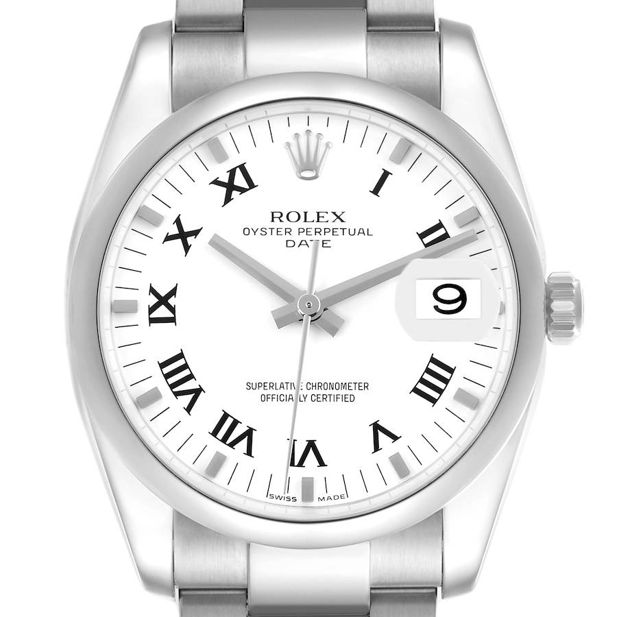 Replica Rolex Date White Dial Oyster Bracelet Steel Mens Watch 115200. Officially certified chronometer self-winding movement. Stainless steel oyster case 34.0 mm in diameter. Rolex logo on the crown. Stainless steel smooth domed bezel. Scratch resistant sapphire crystal with a cyclops magnifier. White dial with Roman numeral hour markers and baton hands. Minute markers around the outer rim. Date calendar at the 3 o'clock aperture. Stainless steel oyster bracelet with an oysterlock clasp. Fits up to a 7.5" wrist.