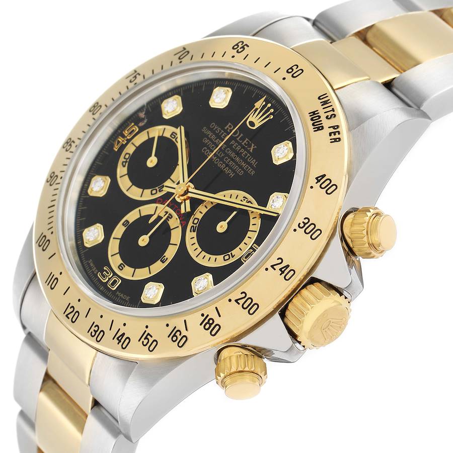 Replica Rolex Daytona Steel Yellow Gold Black Diamond Dial Mens Watch 16523. Officially certified chronometer self-winding movement. Stainless steel and 18K yellow gold case, 40.0 mm in diameter. Special screw-down push buttons. Triplock winding crown protected by the crown guards. 18K yellow gold tachymeter scale engraved bezel. Scratch-resistant sapphire crystal. Black dial with original Rolex factory diamond hour markers and yellow gold baton hands. Outer 1/5th seconds track. Gold outlined subsidiary dials for the seconds, 12-hour, and 30-minute registers. Stainless steel and 18K yellow gold oyster bracelet with flip-lock clasp. Will fit a 7 3/4" wrist.