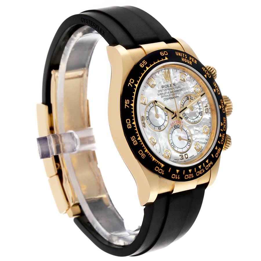 Replica Rolex Daytona Yellow Gold Mother Of Pearl Diamond Dial Mens Watch 116518. Officially certified chronometer automatic self-winding movement. Chronograph function. 18K yellow gold oyster case 40.0 mm in diameter. Special screw-down push buttons. Triplock winding crown protected by the crown guards. Rolex logo on the crown. Black Cerachrom ceramic bezel engraved with the tachymeter scale. Scratch resistant sapphire crystal. Mother of pearl dial with original Rolex factory diamond hour markers and luminescent yellow gold baton hands. Central arrow-tipped chronograph seconds hand. Three subdials - running seconds and the 30-minute and 12-hour chronograph registers. Black rubber Oysterflex strap with an 18K yellow gold flip-lock clasp.