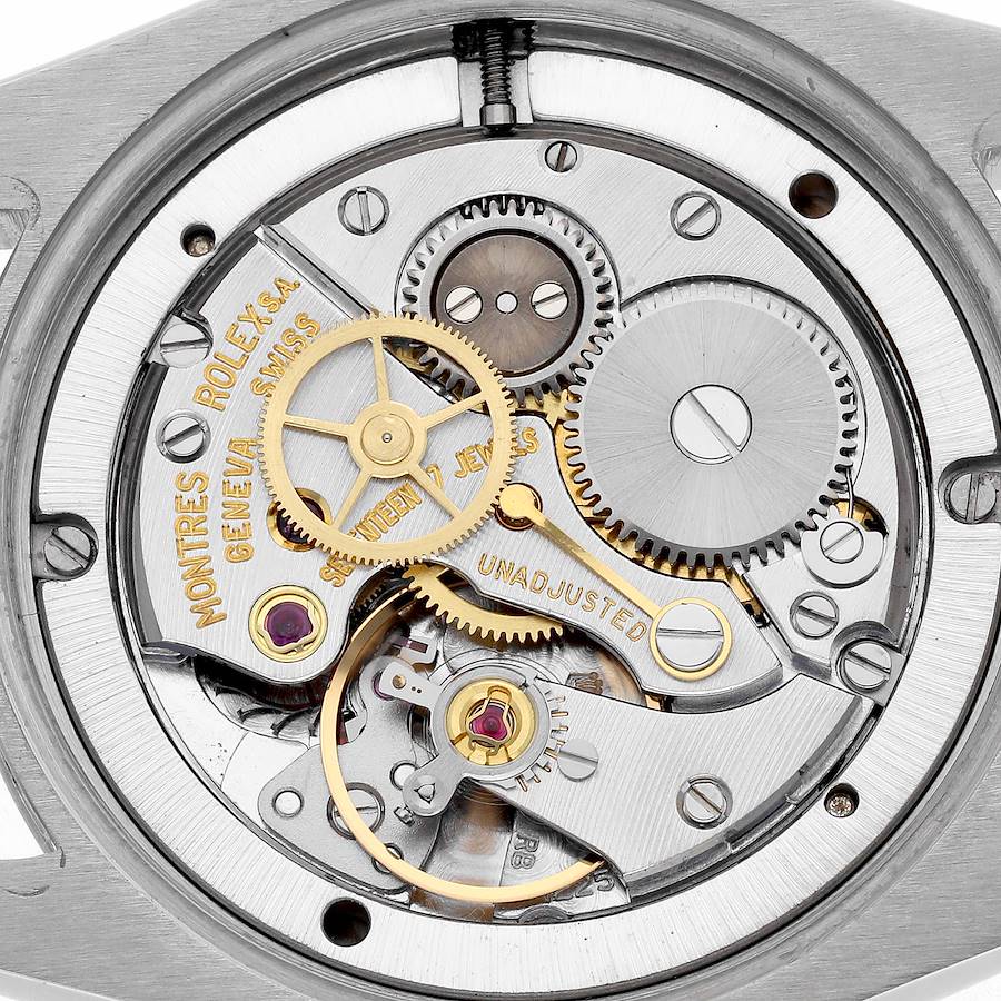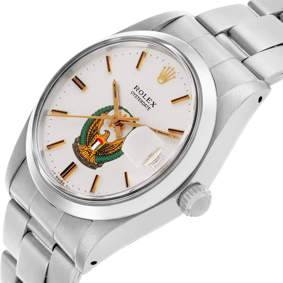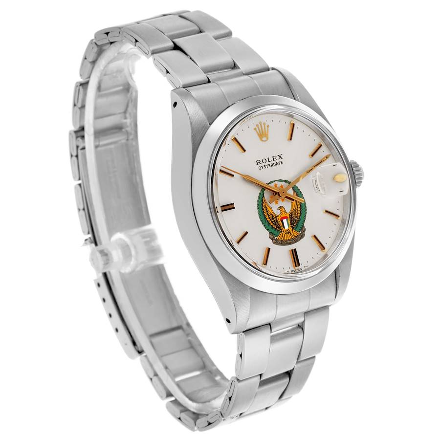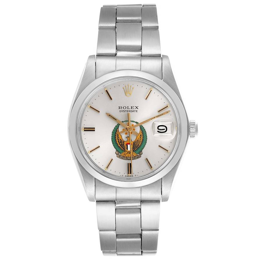 Replica Rolex OysterDate Precision UAE Armed Forces Dial Vintage Steel Mens Watch 6694. Manual-winding movement. Stainless steel oyster case 35.0 mm in diameter. Rolex logo on the crown. Stainless steel smooth bezel. Acrylic crystal with a cyclops magnifier. Silver dial with applied yellow gold baton hour markers and luminescent yellow gold sword-shaped hands. United Arab Emirates Armed Forces logo above 6 o'clock. Date calendar at the 3 o'clock aperture. Stainless steel oyster bracelet with a fold-over clasp. Fits up to a 7 1/4" wrist.