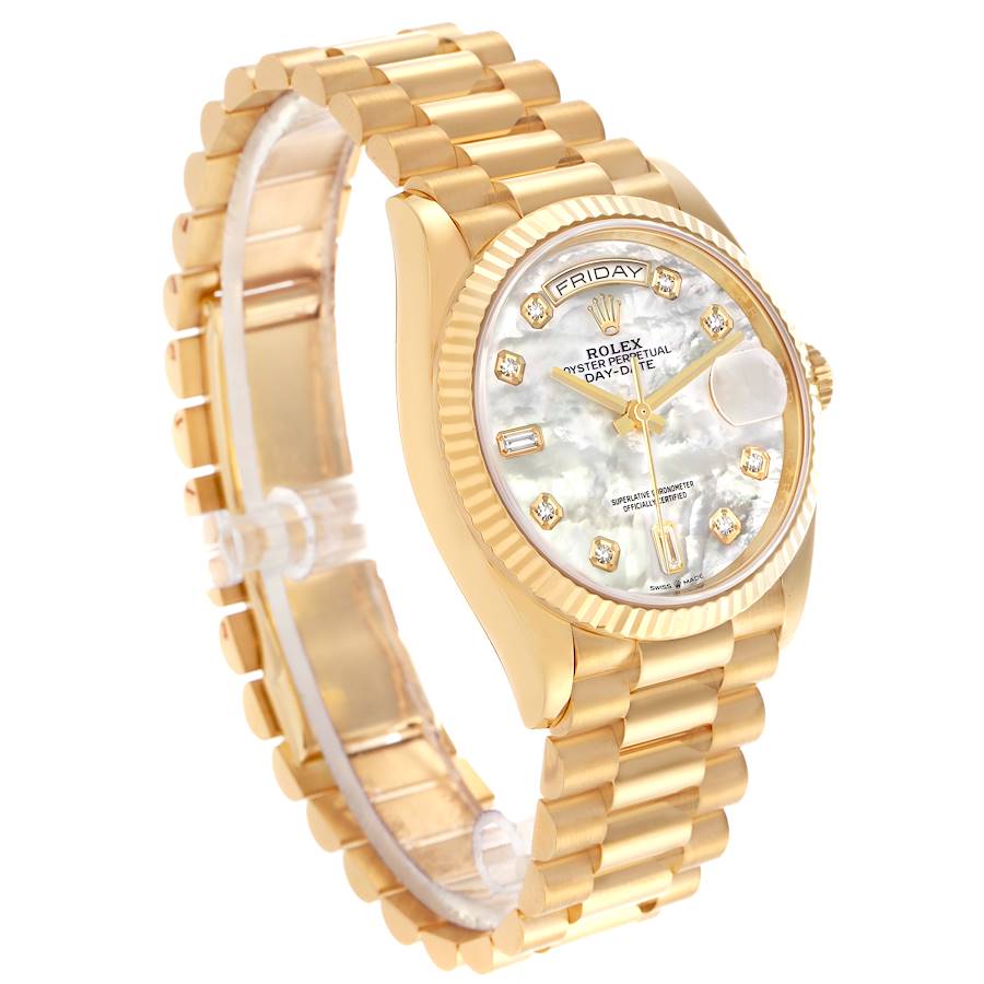 Replica Rolex President Day-Date Yellow Gold Mother Of Pearl Diamond Dial Mens Watch 128238. Officially certified chronometer automatic self-winding movement. 18k yellow gold oyster case 36.0 mm in diameter. Rolex logo on the crown. 18k yellow gold fluted bezel. Scratch resistant sapphire crystal with a cyclops magnifier. Mother of pearl dial with original Rolex factory diamond hour markers and yellow gold baton hands. Sweep center seconds. Aperture for the weekday at 12 o'clock. Date calendar at the 3 o'clock aperture. 18k yellow gold president bracelet with a hidden clasp. Fits up to a 7.5" wrist.
