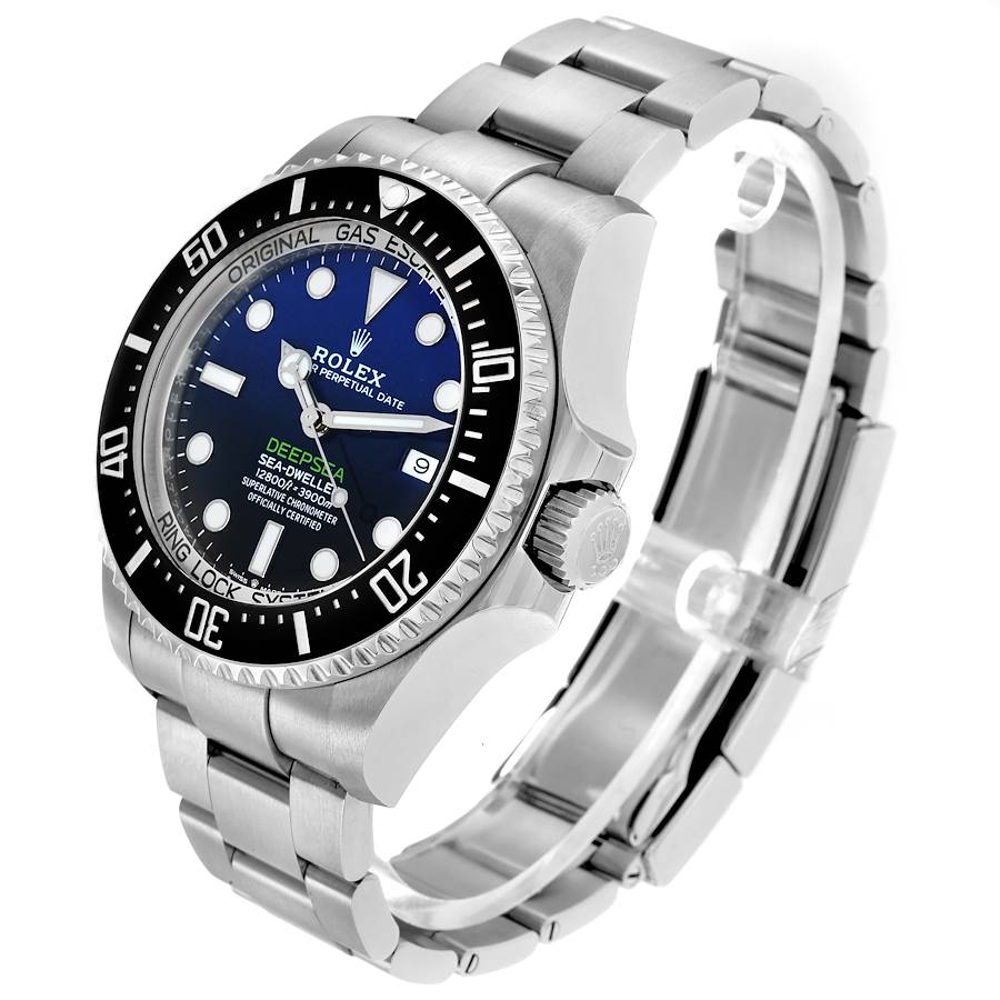 Replica Rolex Seadweller Deepsea 44 Steel Cameron D-Blue Mens Watch 126660. Officially certified chronometer automatic self-winding movement. Stainless steel oyster case 44 mm in diameter. Rolex logo on the crown. Special time-lapse unidirectional rotating Cerachrom ceramic bezel. Scratch resistant sapphire crystal. Gradient deep blue dial with white luminous inlay hands and hour markers. Minute markers around the outer rim. Date calendar at 3 o'clock aperture. Stainless steel oyster bracelet with glide-lock clasp. Fit an 8 3/4" wrist.