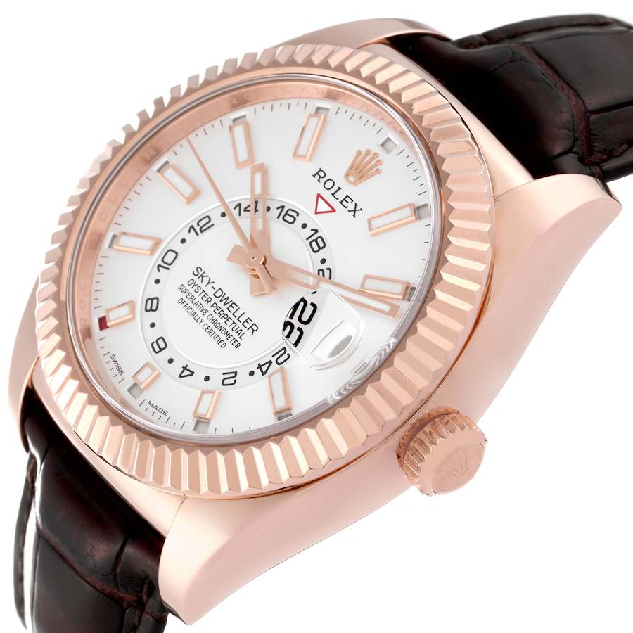 Replica Rolex Sky-Dweller Everose Gold Silver Dial Mens Watch 326135. Officially certified chronometer self-winding movement. Dual time zones, annual calendar. 18K rose gold case 42.0 mm in diameter. Rolex logo on a screw-down twinlock crown. 18K rose gold fluted rotatable ring command bezel. Scratch resistant sapphire crystal with cyclops magnifier. Silver dial with raised rose gold baton hour markers. Centre hour, minute and seconds hands. 24-hour display on off-centre disc. Second time zone. Instantaneous annual calendar at 3 o'clock and rapid-setting of the date. Month display via 12 apertures around the circumference of the dial. Brown crocodile strap with the 18K rose gold folding oysterclasp.