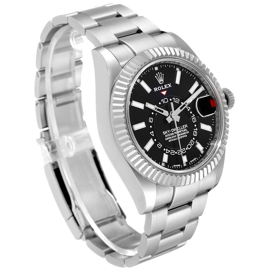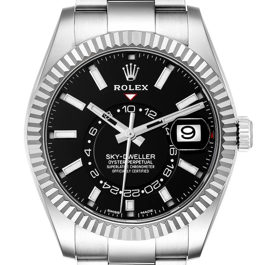 Replica Rolex Sky-Dweller Steel White Gold Black Dial Mens Watch 326934. Officially certified chronometer automatic self-winding movement. Dual time zones, annual calendar. High-performance Paraflex shock absorbers. Stainless steel case 42.0 mm in diameter. Rolex logo on a screw-down twinlock crown. 18K white gold fluted rotatable ring command bezel. Scratch resistant sapphire crystal with cyclops magnifier. Black dial with luminous baton hour markers. Center hour, minute, and seconds hands. 24-hour display on off-center disc. Second time zone. Instantaneous annual calendar at 3 o'clock and rapid-setting of the date. Month display via 12 apertures around the circumference of the dial. Stainless steel oyster bracelet with an Oysterlock clasp and easylink micro-adjustment. Fits up to 7 3/4" wrist.