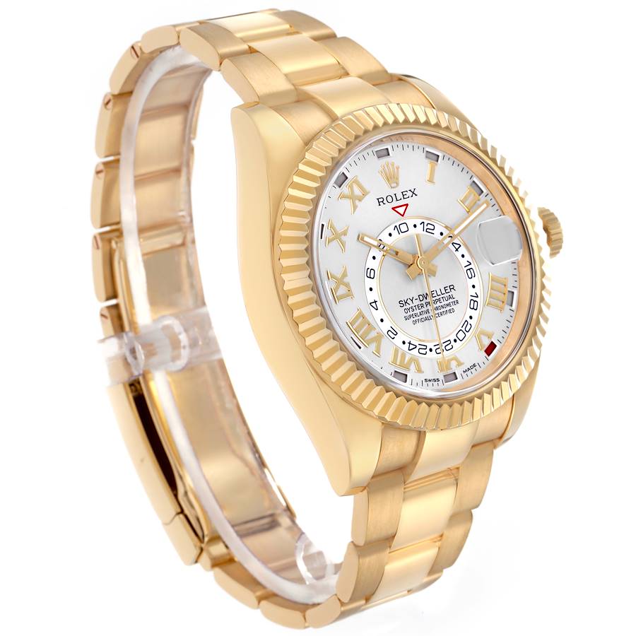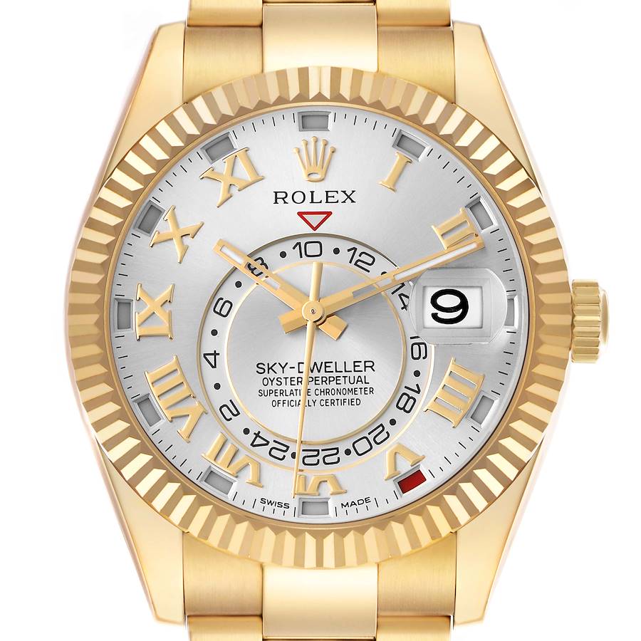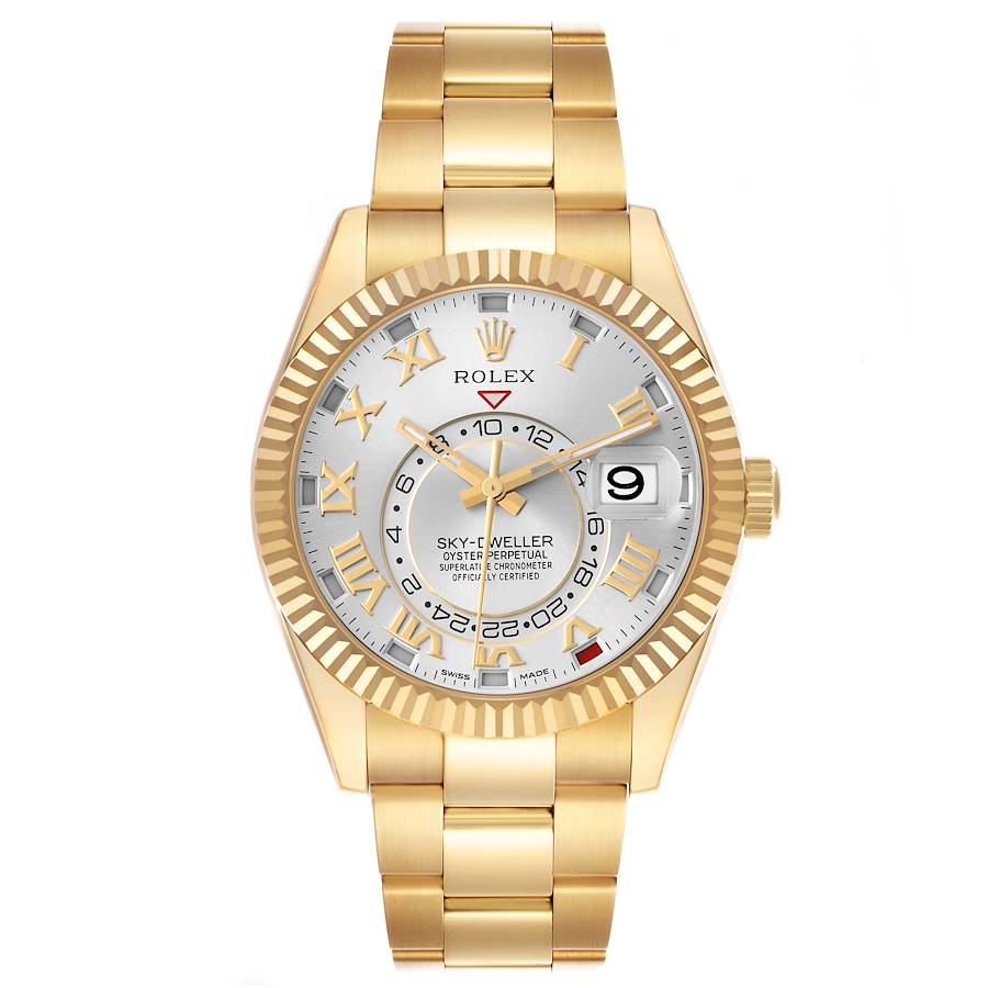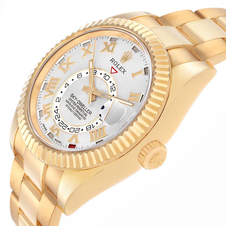 Replica Rolex Sky-Dweller Yellow Gold Silver Roman Mens Watch 326938. Officially certified chronometer self-winding movement. Dual time zones, annual calendar. 18k yellow gold oyster case 42.0 mm in diameter. Rolex logo on the 18k yellow gold screw-down twinlock crown. 18K yellow gold fluted rotating ring command bezel. Scratch resistant sapphire crystal with a cyclops magnifier. Silver dial with luminescent yellow gold baton hands and raised yellow gold Roman numeral hour markers. 24-hour display on off-centre disc. Instantaneous annual calendar at 3 o'clock with rapid-setting of the date. Month display via 12 apertures around the circumference of the dial. 18k yellow gold oyster bracelet with an oysterclasp clasp. Fits an 8'' wrist.