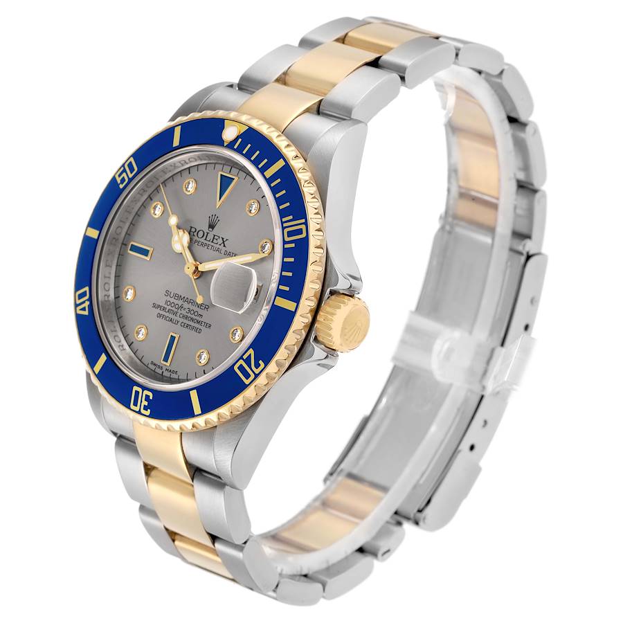 Replica Rolex Submariner Steel Yellow Gold Diamond Serti Mens Watch 16613. Officially certified chronometer automatic self-winding movement. Stainless steel and 18k yellow gold oyster case 40.0 mm in diameter. Rolex logo on the 18k yellow gold crown. Pointed crown guards. Blue insert special time-lapse unidirectional rotating yellow gold bezel. Scratch resistant sapphire crystal with a cyclops magnifier. Slate dial with original Rolex factory diamond and sapphire hour markers. Luminescent yellow gold Mercedes hands. Luminescent yellow gold lollipop-tipped centre seconds hand. Date calendar at the 3 o'clock aperture. Outer minute marker track. Stainless steel and 18k yellow gold oyster bracelet with a flip-lock clasp. Fits a 7.5" wrist.